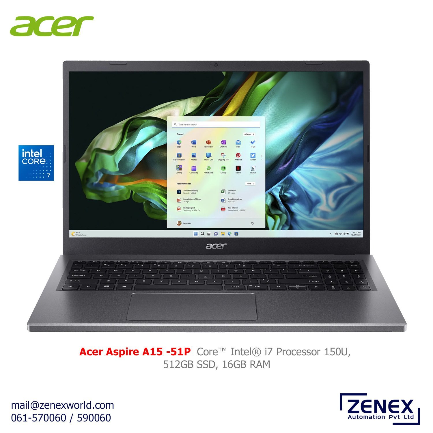 Acer Aspire 15 comes with 14th Gen Intel Core i7-150U Processor (12MB Cache, up to 5.4 GHz, 10 cores), Intel® Graphics, 16GB LPDDR5 RAM, 512GB PCIe NVMe Gen4 SSD, 15.6-inch IPS display; Full HD (1920 x 1080 pixels) resolution, high-brightness Acer ComfyView LEDbacklit TFT LCD, English International Non-Back lit Keyboard, Free Backpack and Mouse, comes with 1 Years of Warranty.